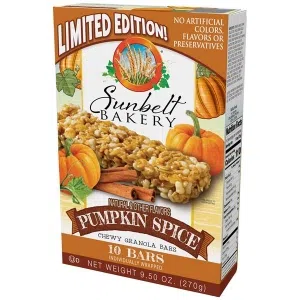 6. Sunbelt Bakery Pumpkin Spice Chewy Granola Bars. These granola bars are great for an autumn snack! I usually don’t like granola bars, but this bar makes my inner ghoul “BOO!” with excitement! They’re a great seasonal snack to toss in your lunch box. You can buy them almost anywhere.